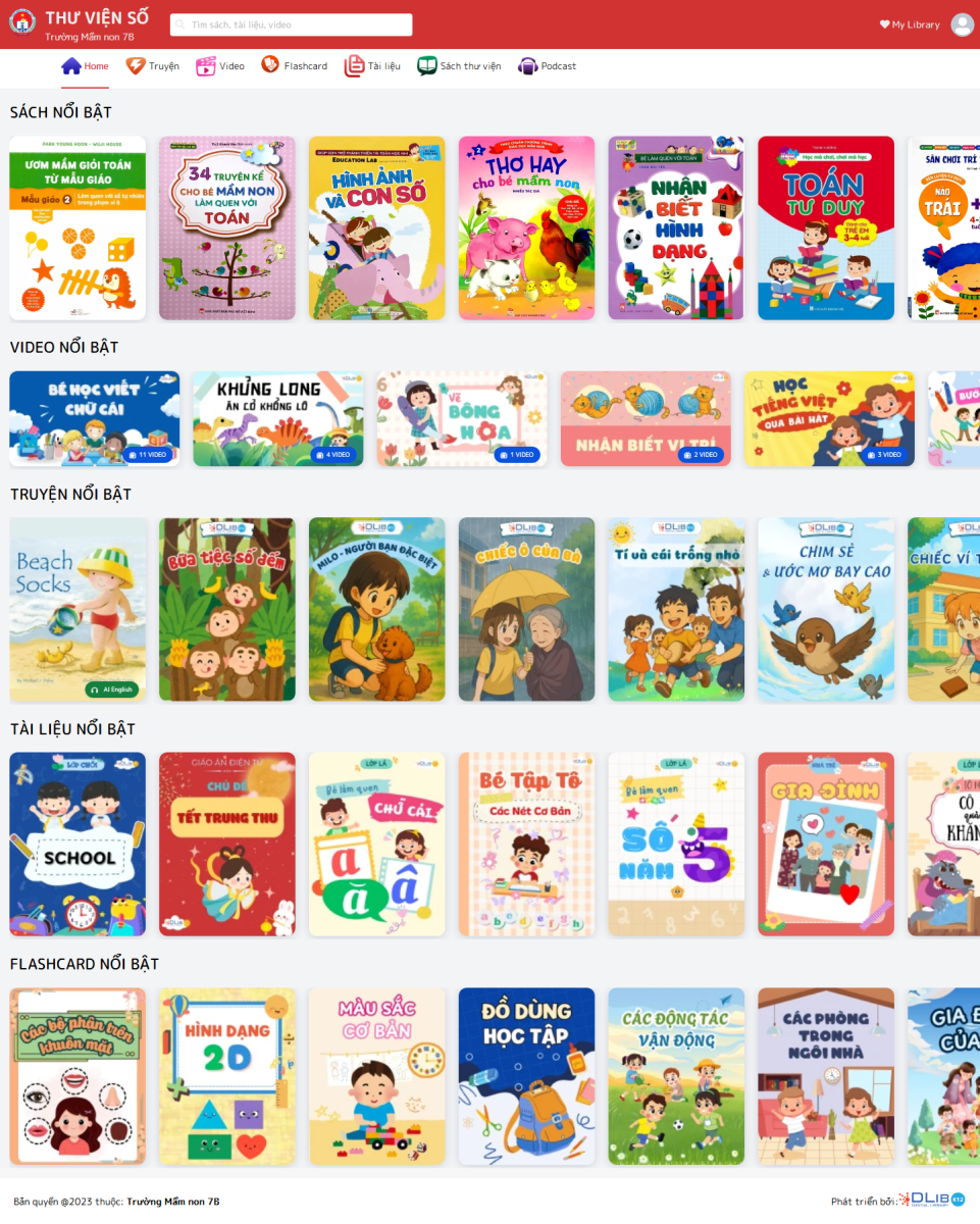 •  Sách giấy: Thư viện số Dlib MN quản lý và số hoá sách thư viện theo chuẩn Dublin Core, giúp tìm kiếm và truy xuất thông tin dễ dàng. Môi trường số tiện lợi cho quản lý tài nguyên và mượn trả. Phụ huynh và học sinh dễ dàng tiếp cận nguồn tài nguyên, khuyến khích đọc sách tại thư viện hoặc mượn về nhà.